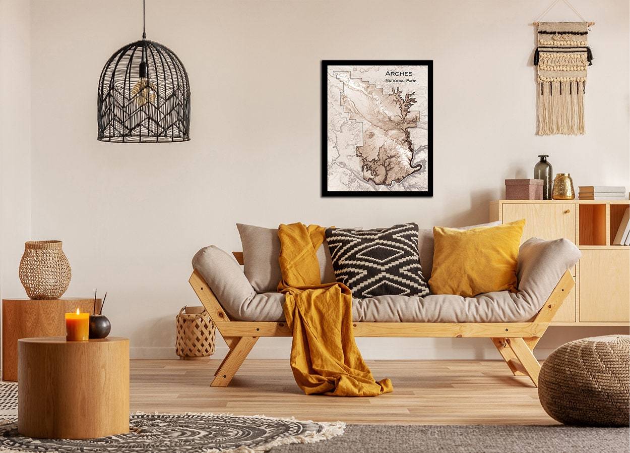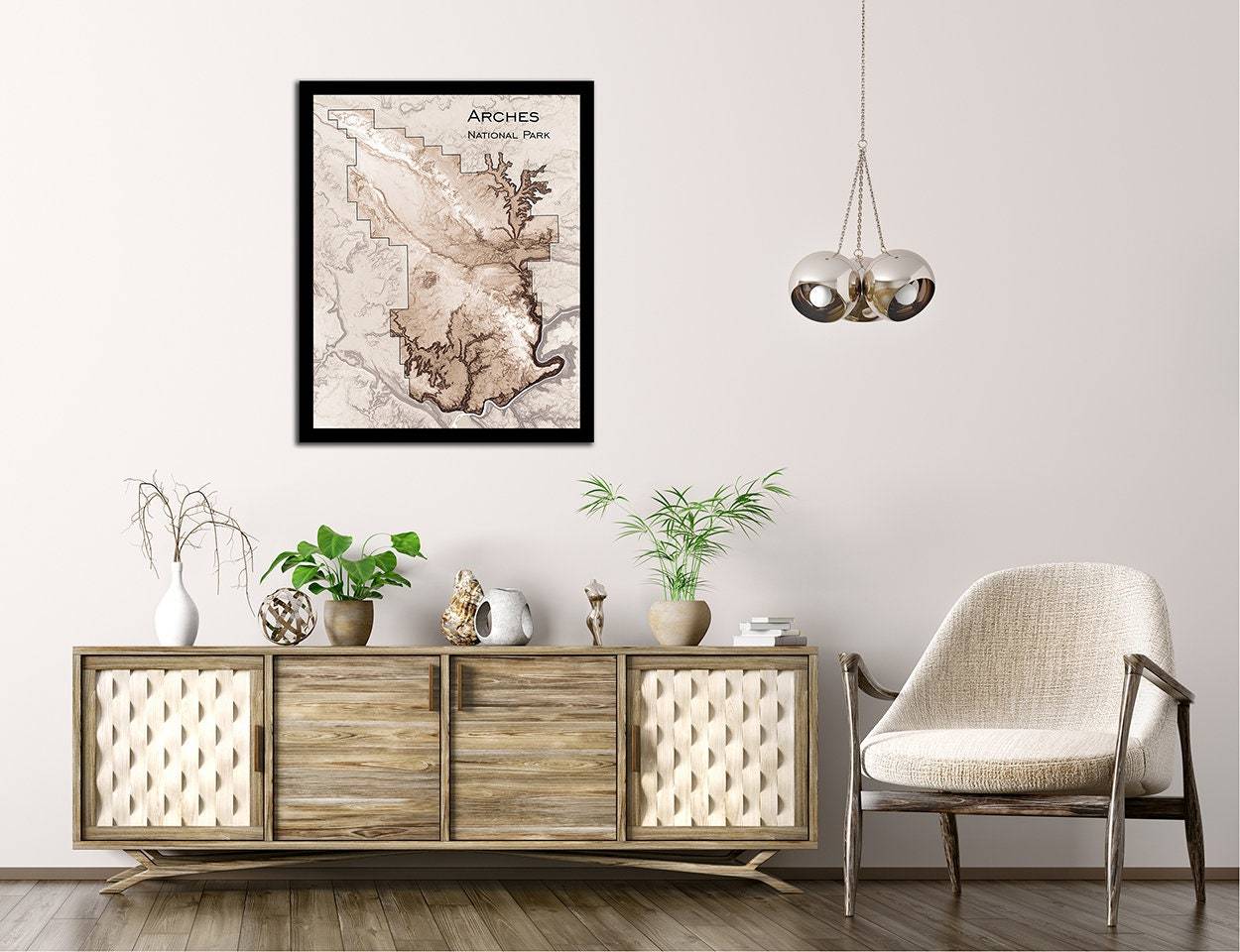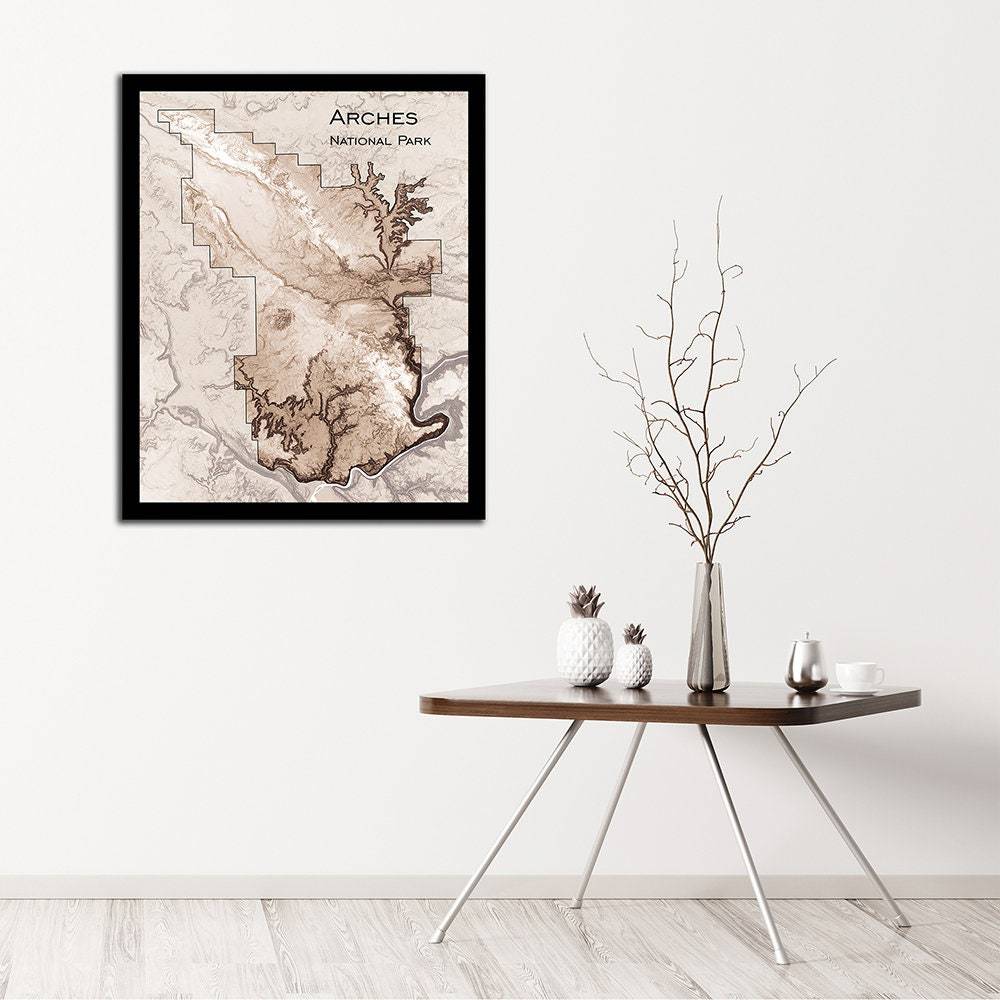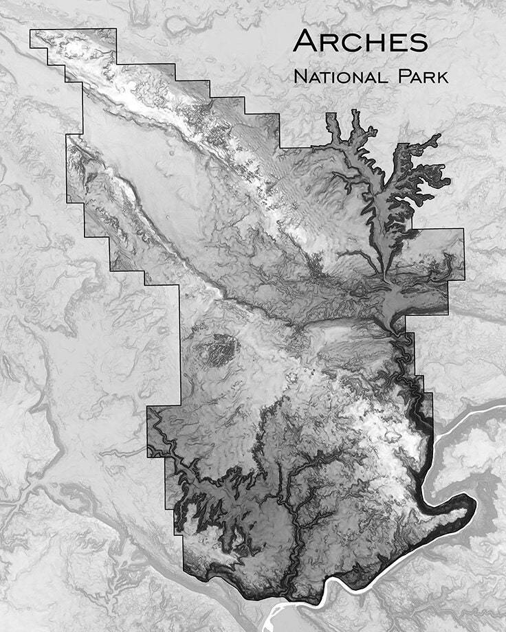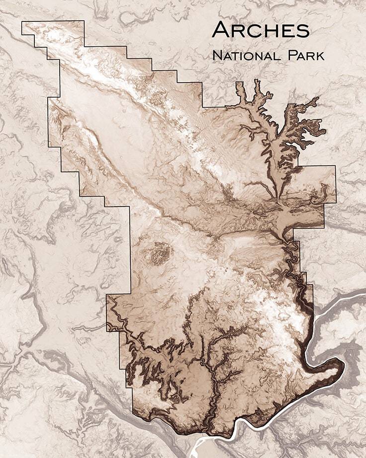 Topographic map print with our unique shading of elevation and slope to highlight natural features. Our maps have exquisite detail, whether viewed from across the room or within inches of the map.