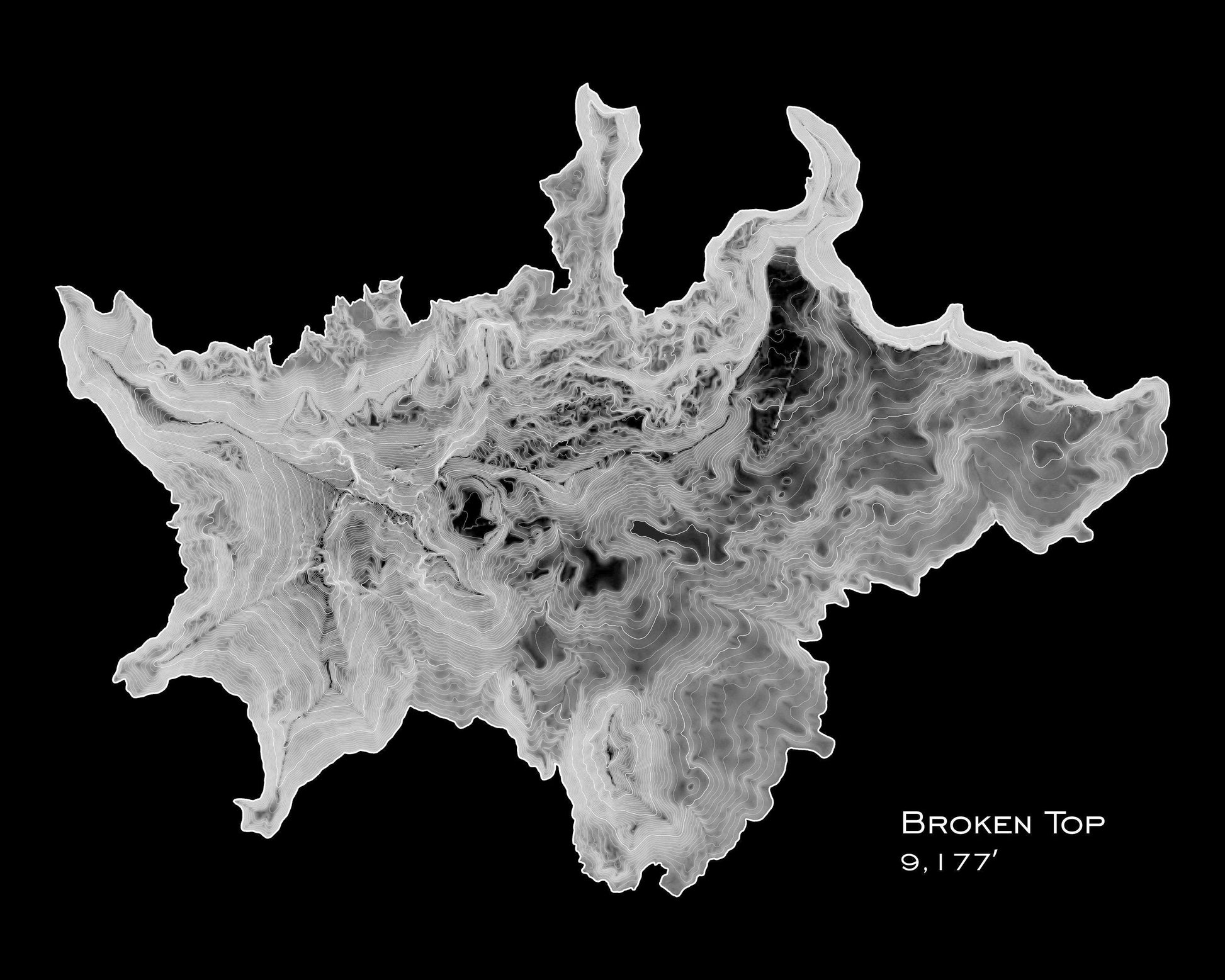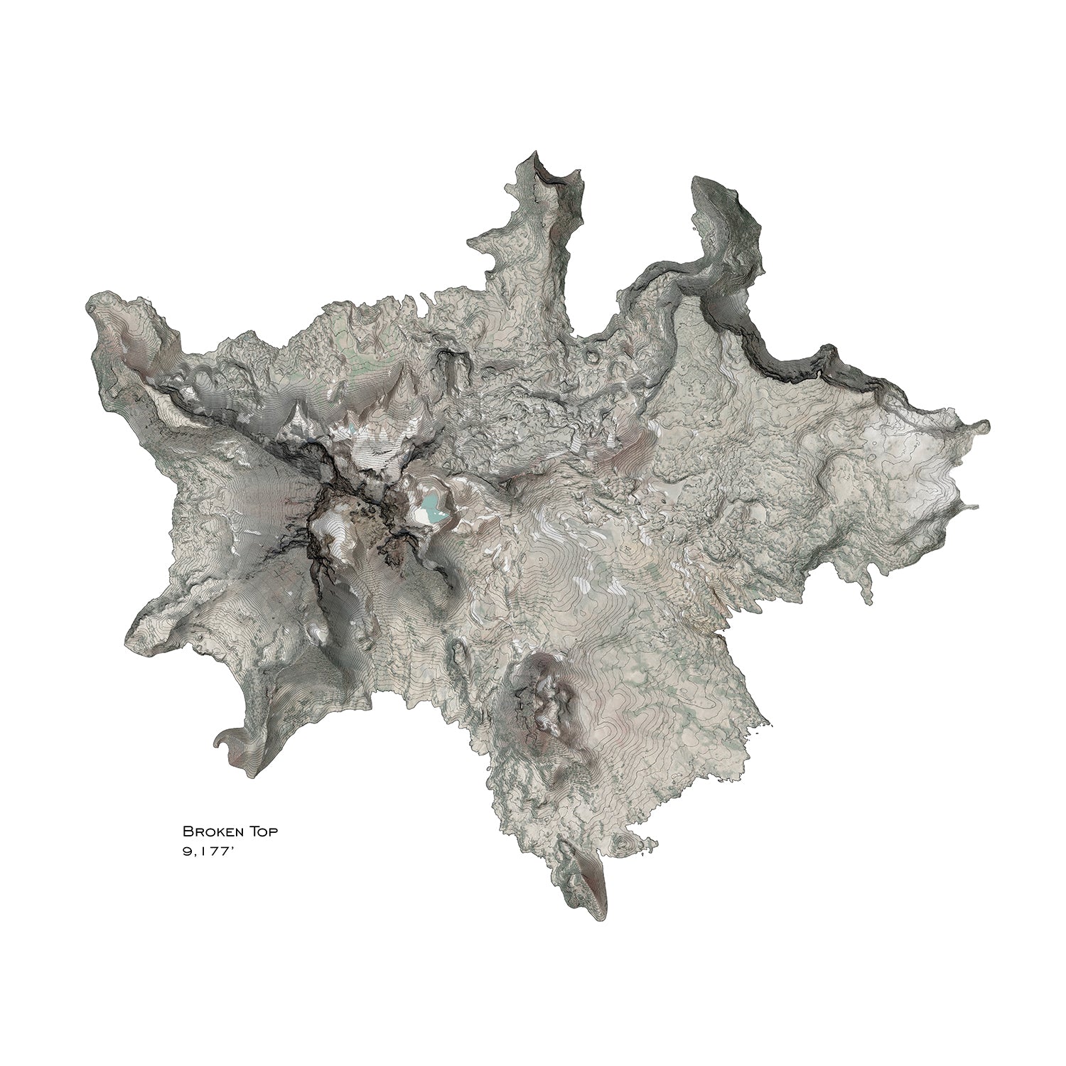 Broken Top is a deeply eroded volcano next to the Three Sisters in Oregon. Contours every 20ft with major contours every 200ft. Our maps have exquisite detail, whether viewed from across the room or within inches of the map.