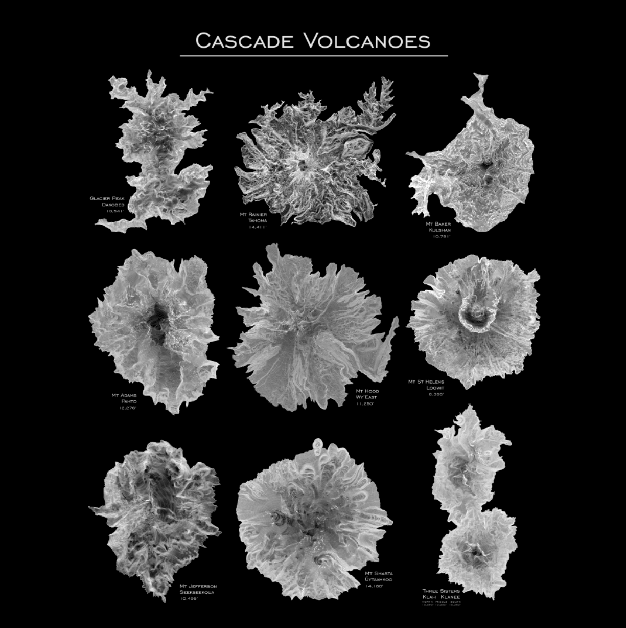 A compilation print of our maps of the highest peaks in the Pacific Northwest, each with it;s own unique character. Mt Baker, Glacier Peak, Mt Rainier, Mt Adams, Mt St Helens, Mt Hood, Mt Jefferson, Three Sisters, Mt Shasta. All these volcanoes rise dramatically above the rich forests and rugged canyons of the cascades below.