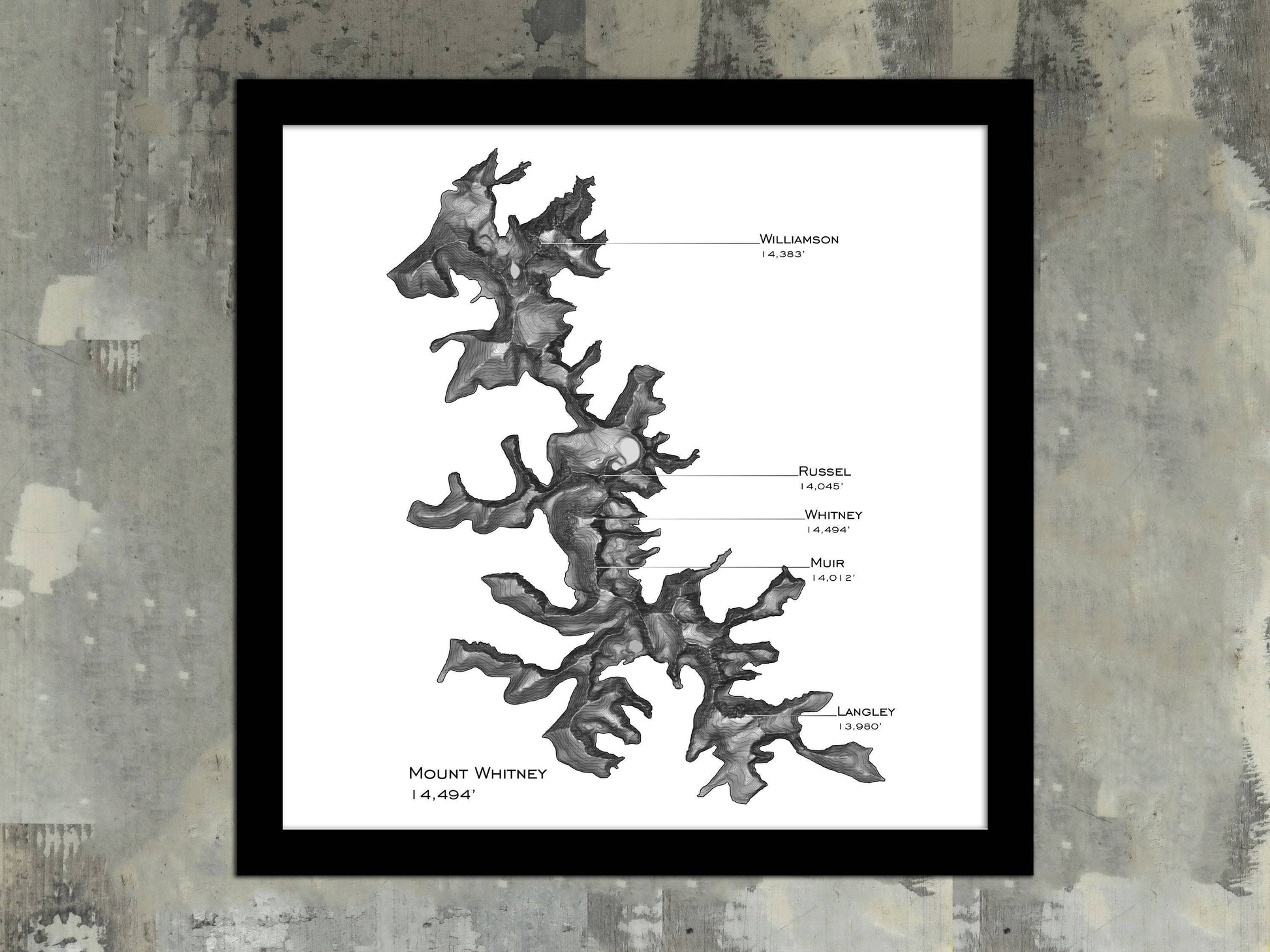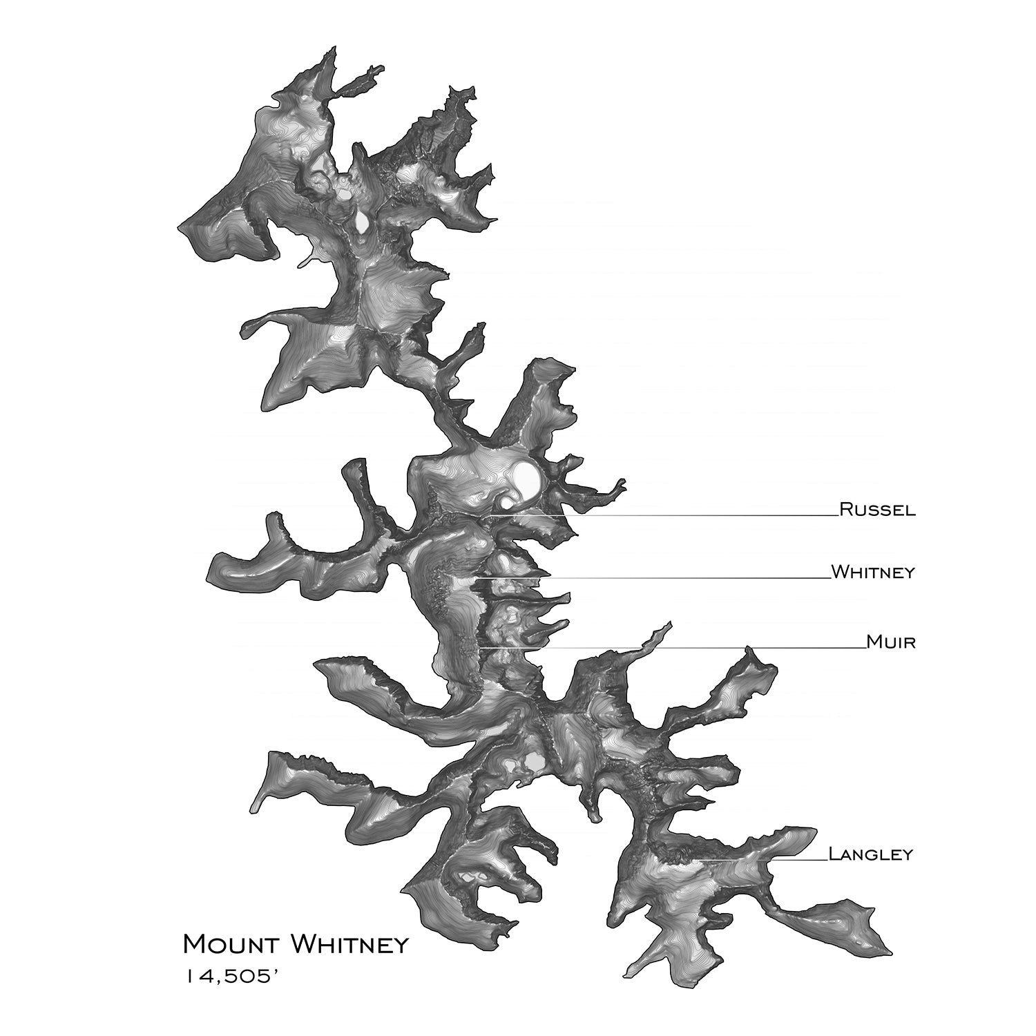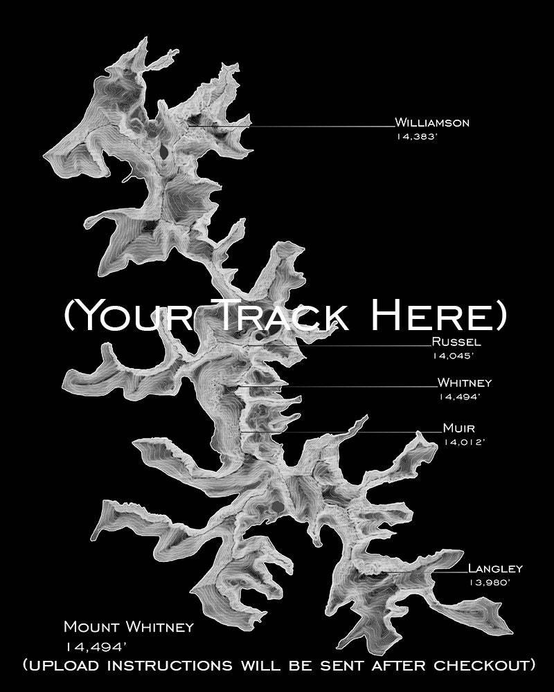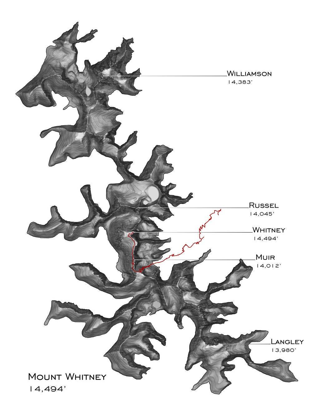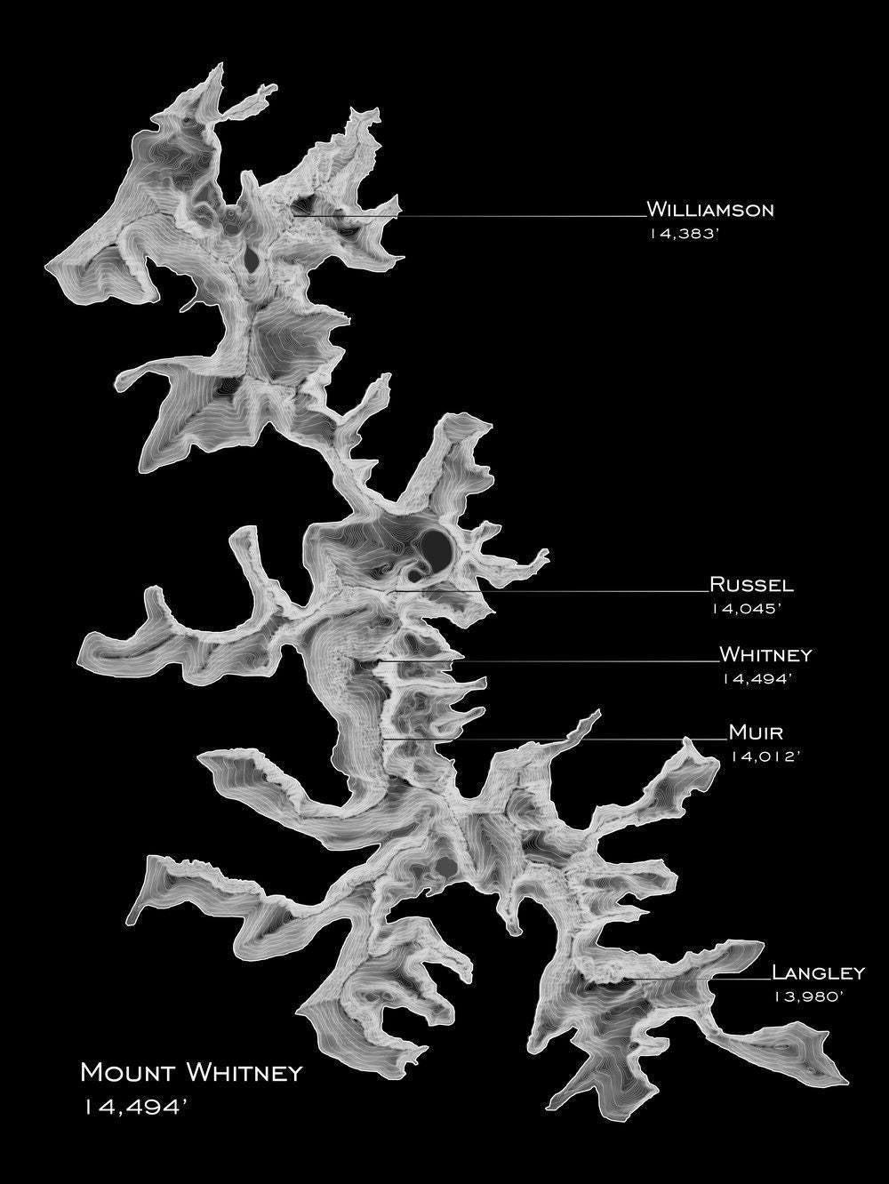 Mount Whitney, or Tumanguya, is the tallest peak in the contiguous 48. The mountain is popular for backpackers and hikers, and lays on the stunning John Muir trail. For the more adventurous, there are many advanced alpine routes. Contours every 15ft with major contours every 150ft. This map begins at an elevation of 12060ft.
