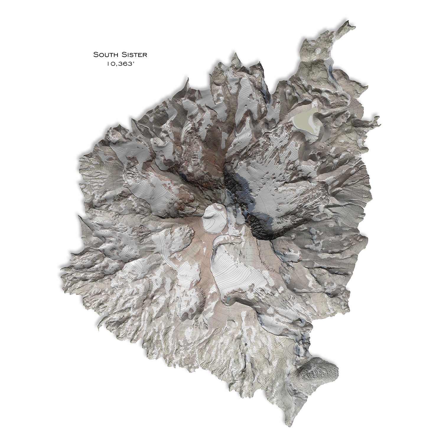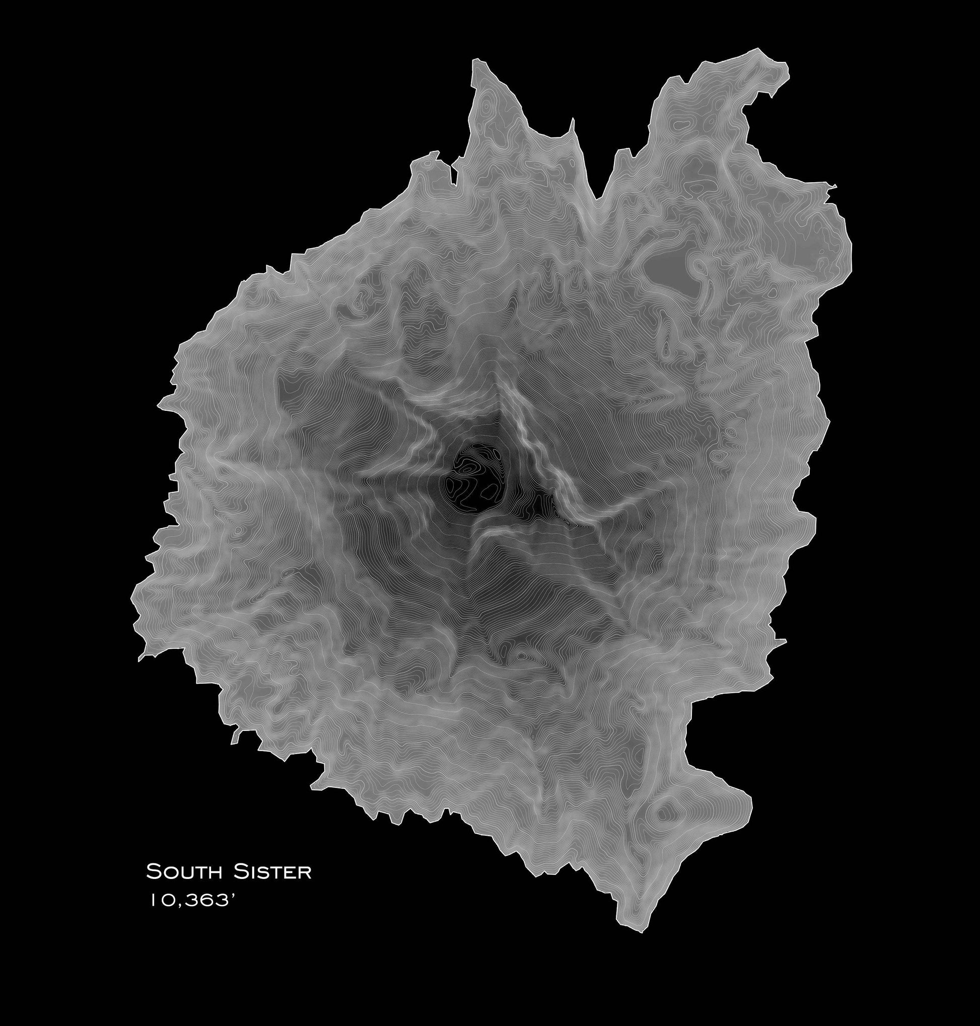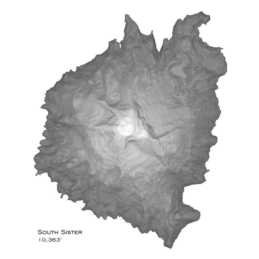 South Sister volcano is the tallest and youngest of the Three Sisters. The summit holds Teardrop pool, the highest lake in Oregon. It is a popular destination for hikers and skiers in the spring. Contours every 15ft with major contours every 150tt. The map begins at an elevation of 7400ft.
