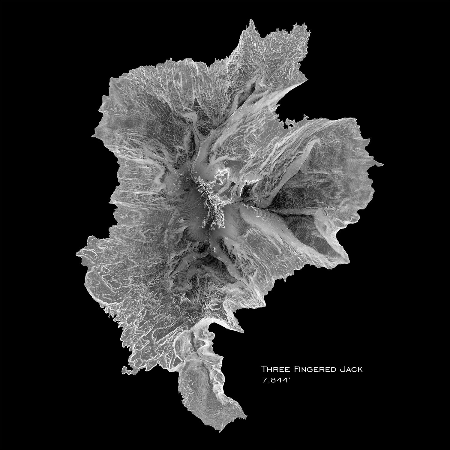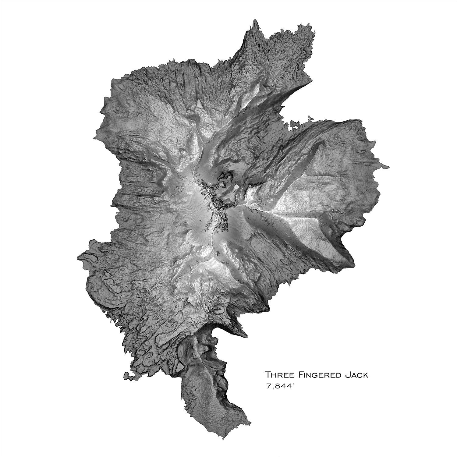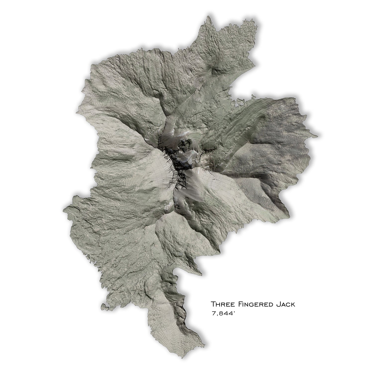 Three Fingered Jack is a heavily eroded shield volcano, the origin of the name is debated. Minor contours every 20ft with majors every 200ft This map begins at an elevation of 5500ft.