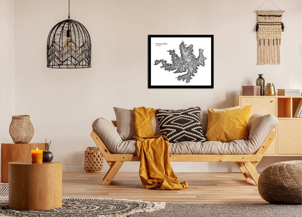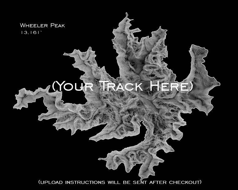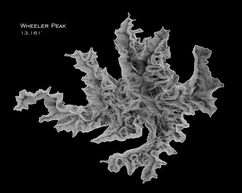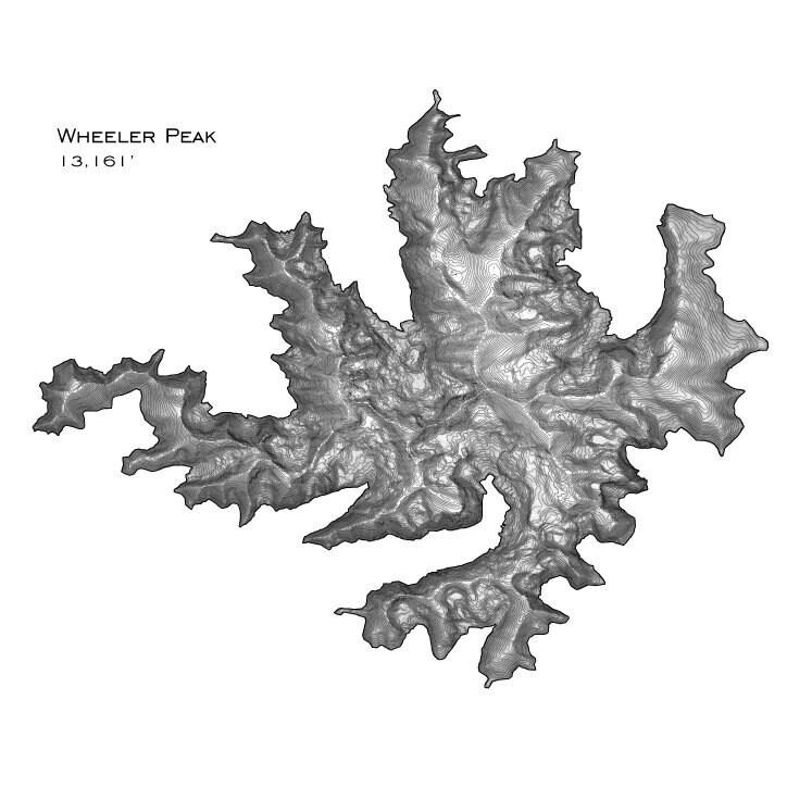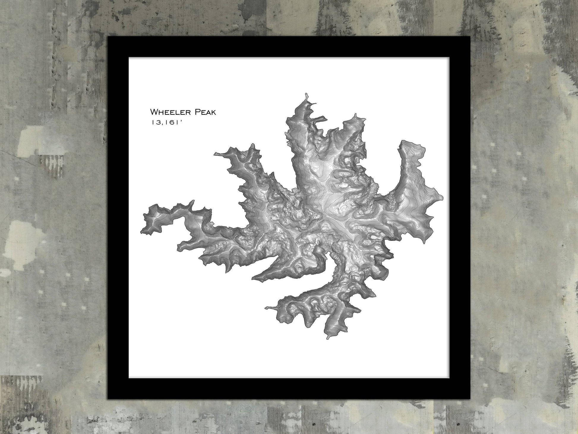 Located near Taos in northern New Mexico, Wheeler Peak is the tallest point in the state. Topographic map print with our unique shading of elevation and slope to highlight natural features. Contours every 40ft.